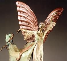 Wings spread, arms outstretched and toes pointed, she is trailed closely by two tiny faerie accomplices who loyally hold the train of her iridescent gown.