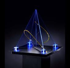 Four clear panes meet in the center of “Kantik,” forming a glowing pyramid structure through which a coil of yellow light magically shoots.
