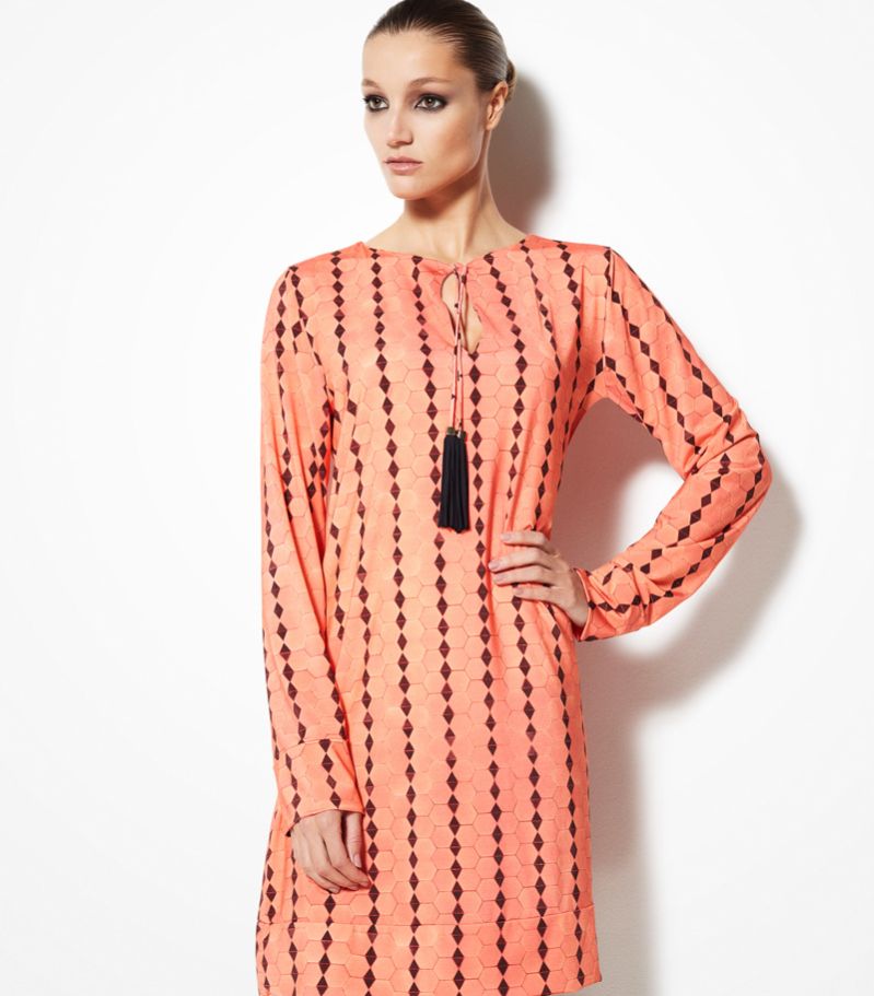 Short dress with a belt for a sexy waist effect. Tender colours for sunny feeling. Flattering round neck, 3/4 sleeves